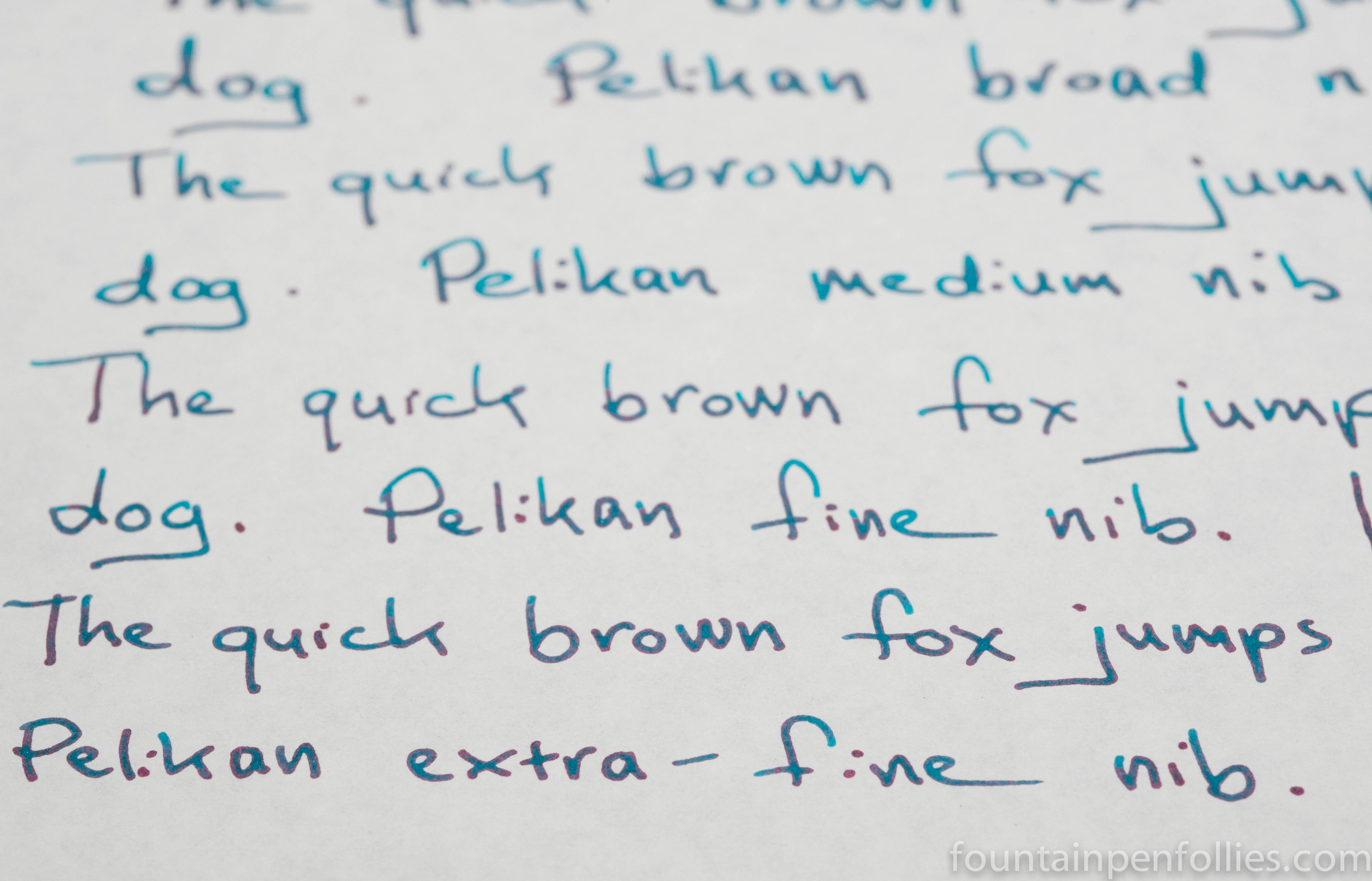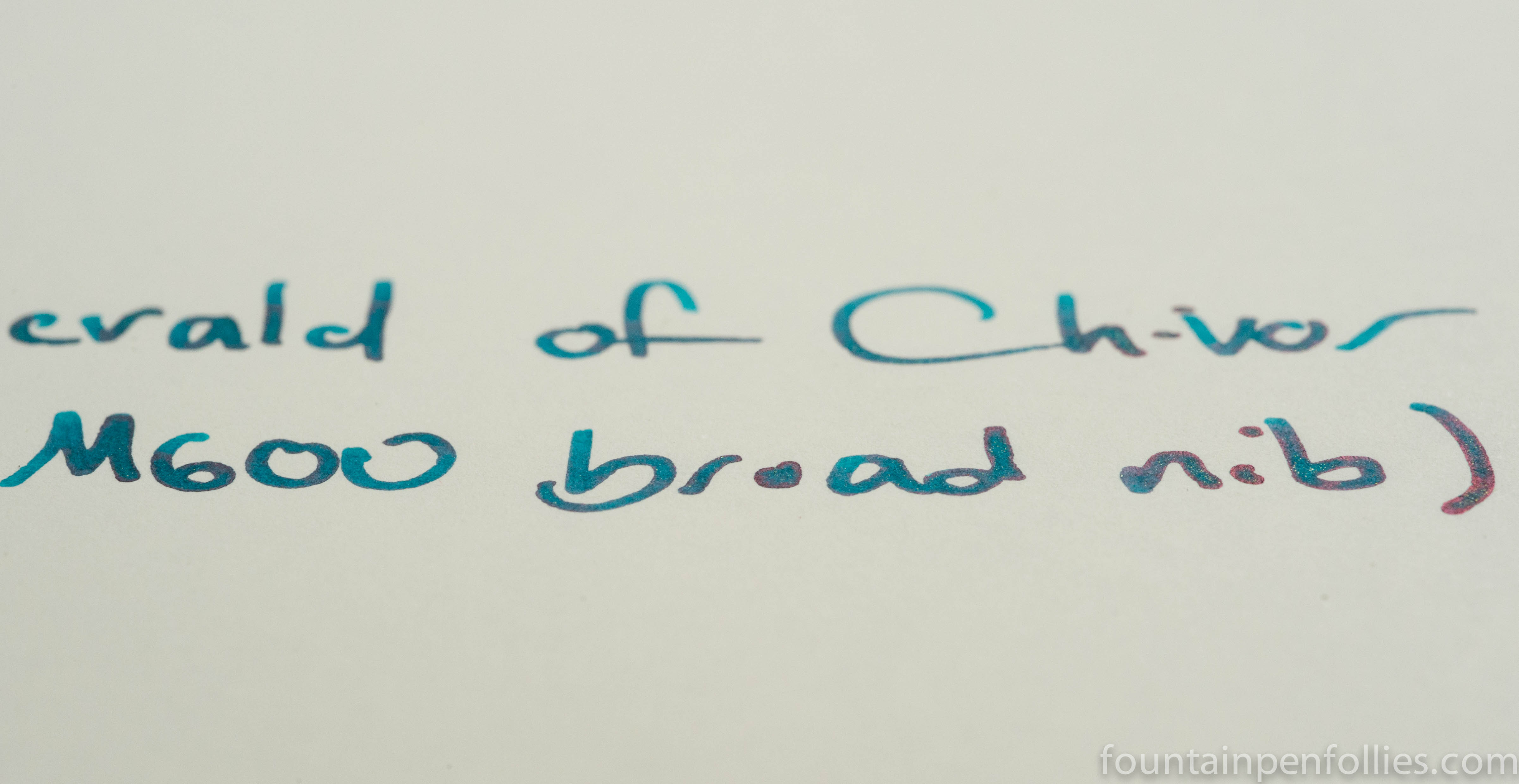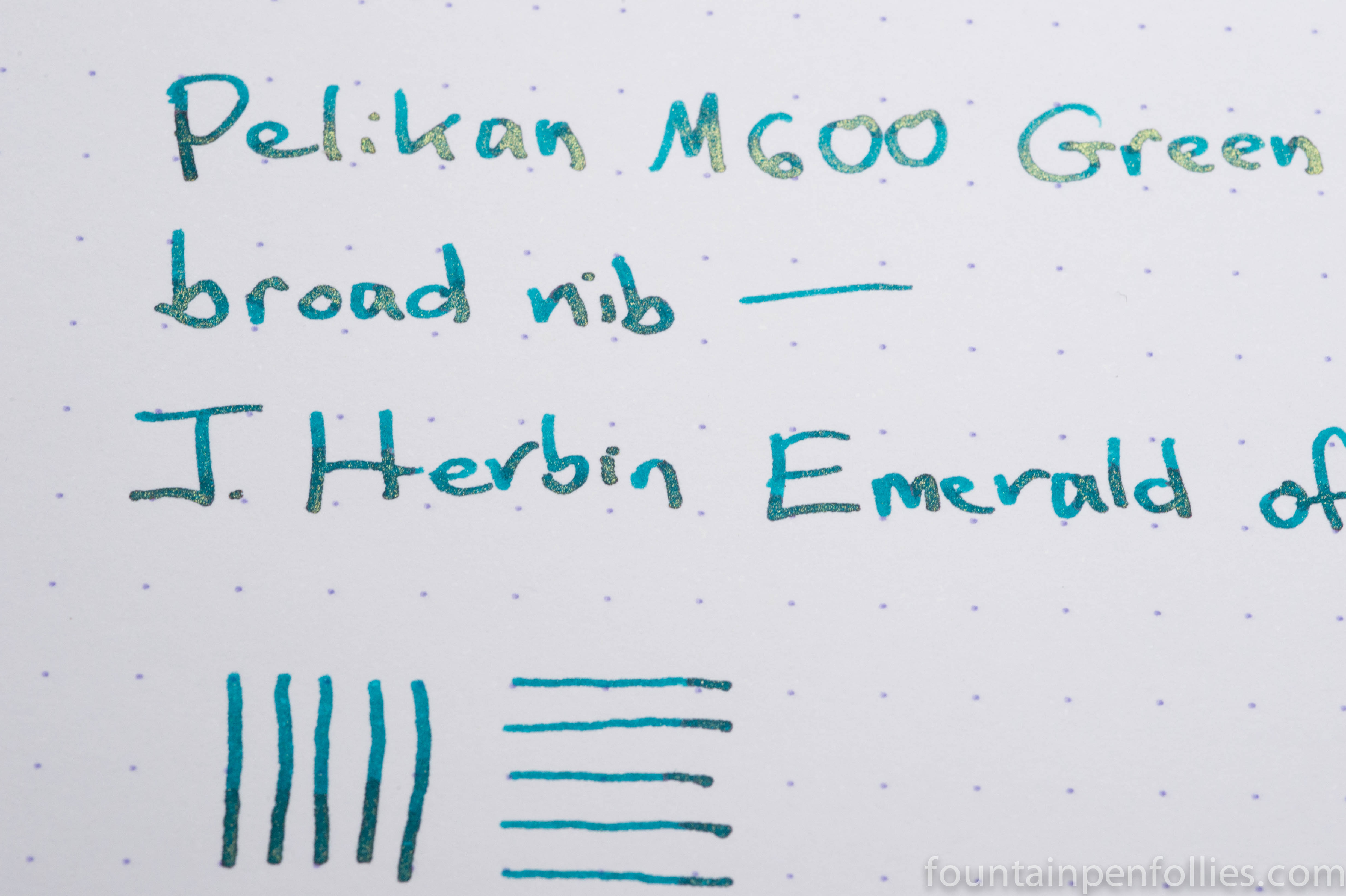 Pelikan M600 Green o’ Green with broad nib. A good friend sent me a sample of the new J. Herbin Emerald of Chivor, so I brought out my big gun, nib-wise. A Pelikan broad. That’s as big as things generally get for me. I’m more of an extra-fine person.