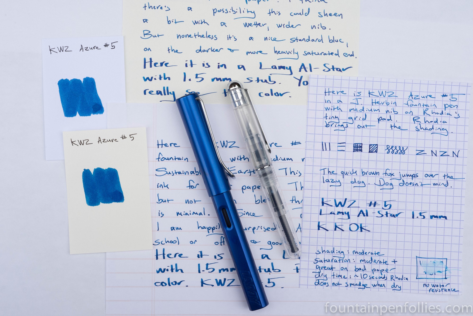 KWZ Azure #5. This is a sprightly blue ink that does very well on poor quality paper. I have been using this in a Lamy Al-Star with various nibs and in a J. Herbin fountain pen with a medium nib. It has worked well in both pens, which is notable, because the Safari tends to write dry and the J. Herbin has a wet flow.