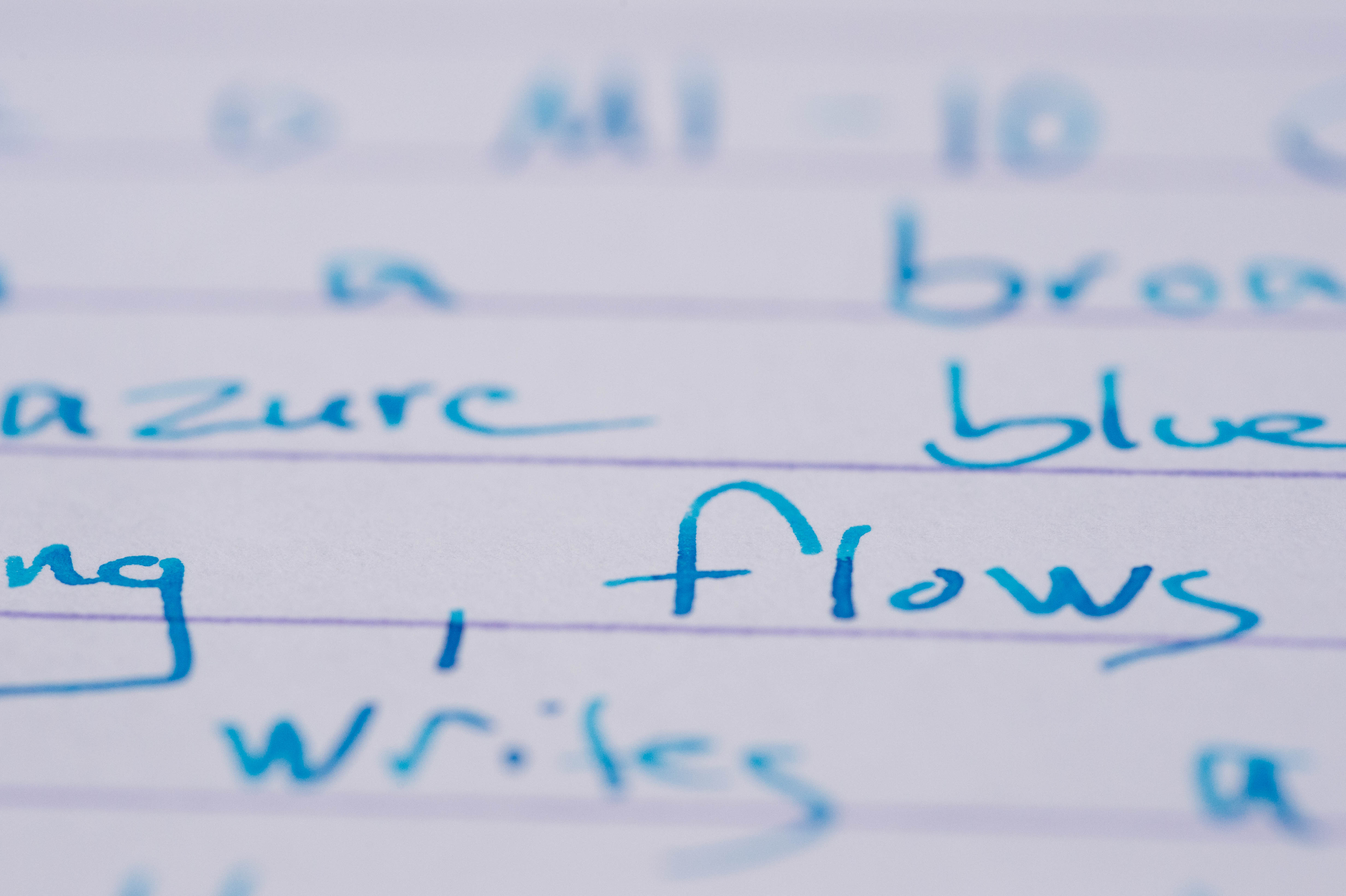 Lloyd is darker than Carli, a medium blue with something that lifts it above a standard blue color like my oft-used Waterman Serenity Blue. With Lloyd, I see a bit of shading, once the ink dries, but less than Carli. Instead Lloyd has a bold and dramatic presence that is accentuated as the nib width increases. It’s a wetter ink, but it never gushes, and it feels nicely lubricated. To me, Lloyd is also a fairly pure blue. Just as Carli does not lean green or stray into turquoise territory, so Lloyd doesn’t lean purple and approach royal blue. That purity of blueness is a nice quality of both inks. They each look more blue than many similar inks. Lloyd, however, is a more saturated ink than Carli, and accordingly takes longer to clean from a pen.