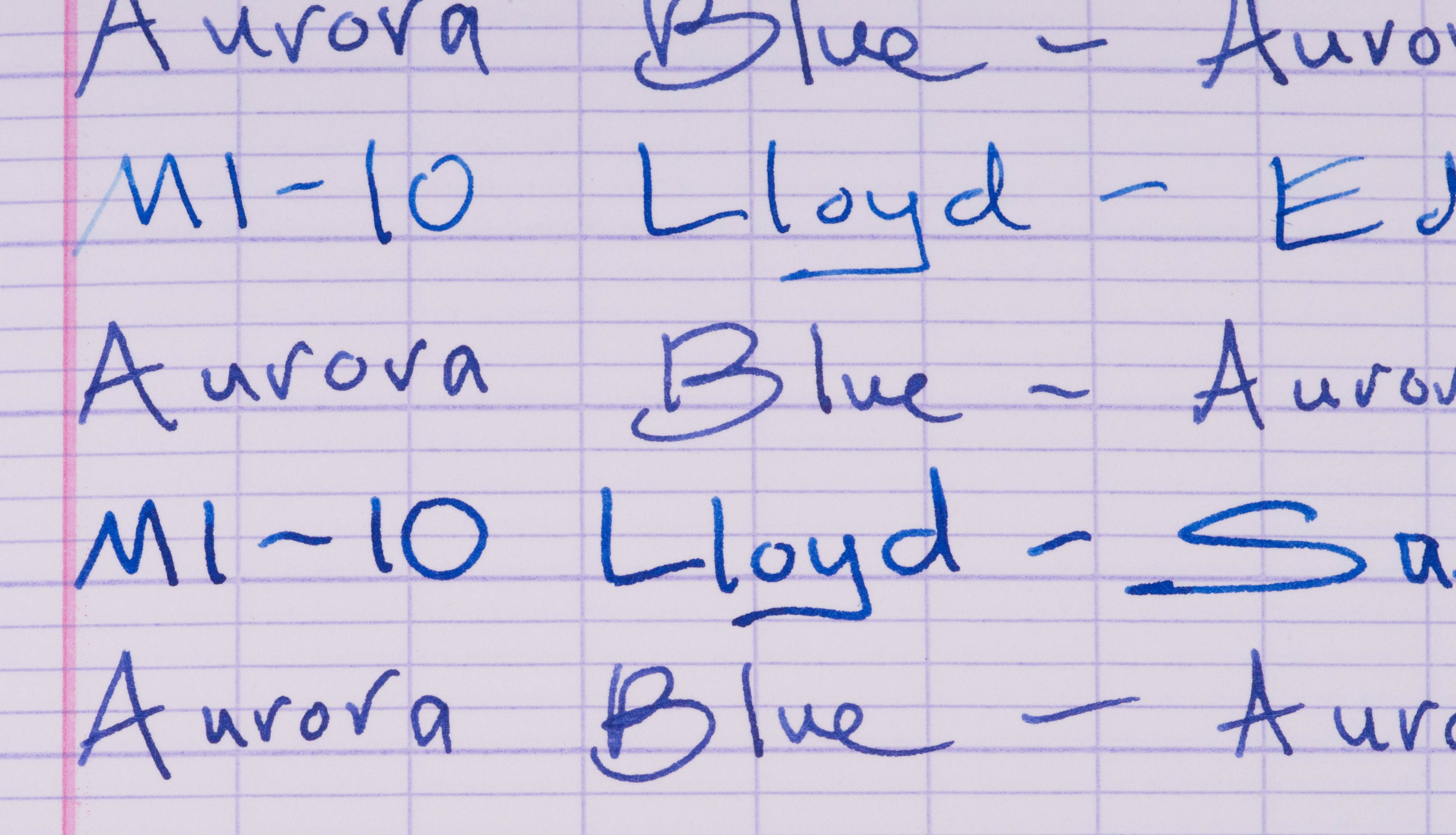 As to whether Lloyd is different than most standard blue inks, well, I think so, though I may be counting angels on the head of a pin with that distinction. A standard blue ink, often used in school or work settings, is that familiar medium blue whose virtue lies precisely in its unexceptional and unremarkable nature. It is an ink that does not call attention to itself, but acts almost as a neutral ground, offending no one but also grabbing no one. In contrast, Lloyd grabs me. Here you can see Lloyd alternating in different pens with Aurora Blue, a standard blue ink that I use frequently. Lloyd to me is a purer, brighter blue with some sheen possibilities, that stands out on the page in a way that standard blue inks don’t.