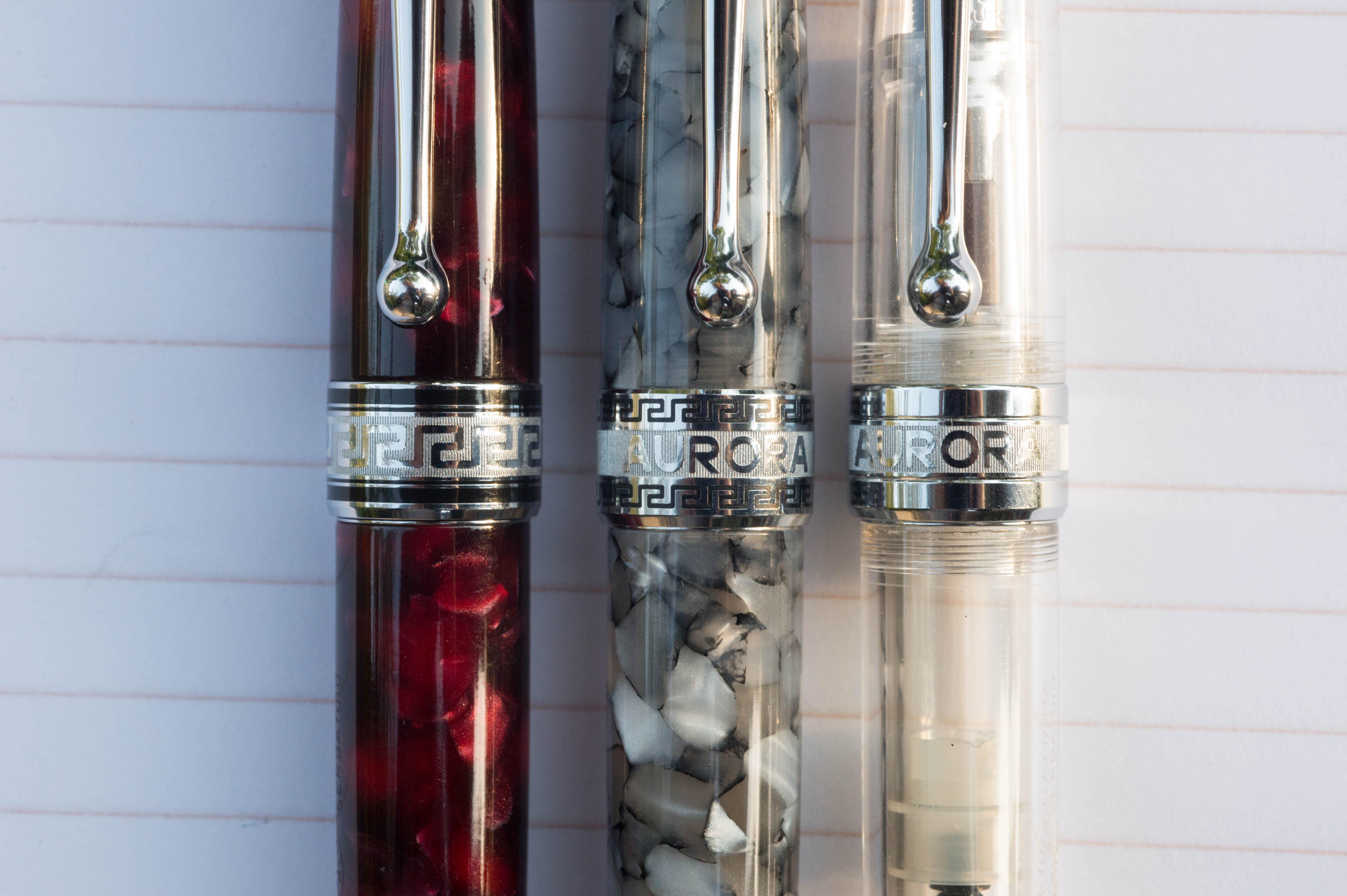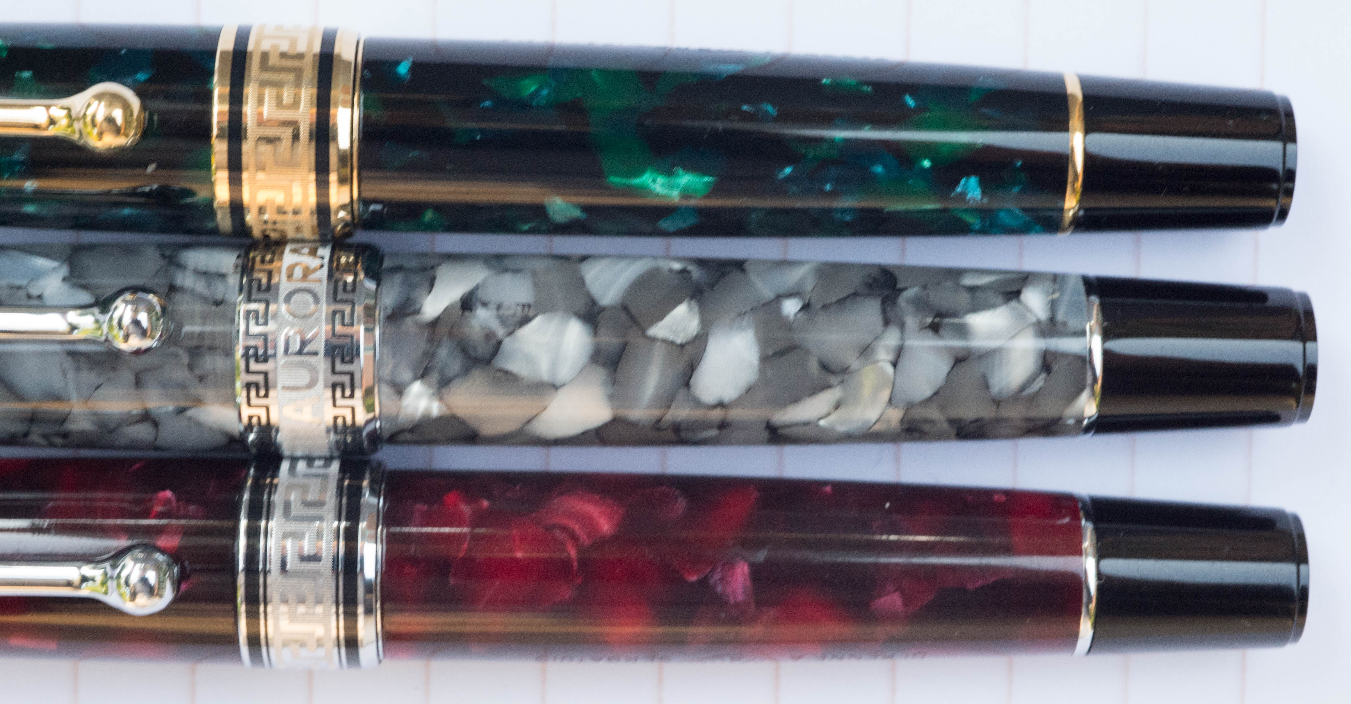 The cap bands also lend variety. There are a lot of different designs. Even if you just look at the two types of Optimas I own, you can see that the demonstrator cap band differs from the regular Auroloide cap bands. Then my Auroloide pens have two styles of cap bands: the older style has three metallic bands with black in between, while the new-style one has one integrated cap band with “Aurora” in the middle area instead of the old-style Greek key design.