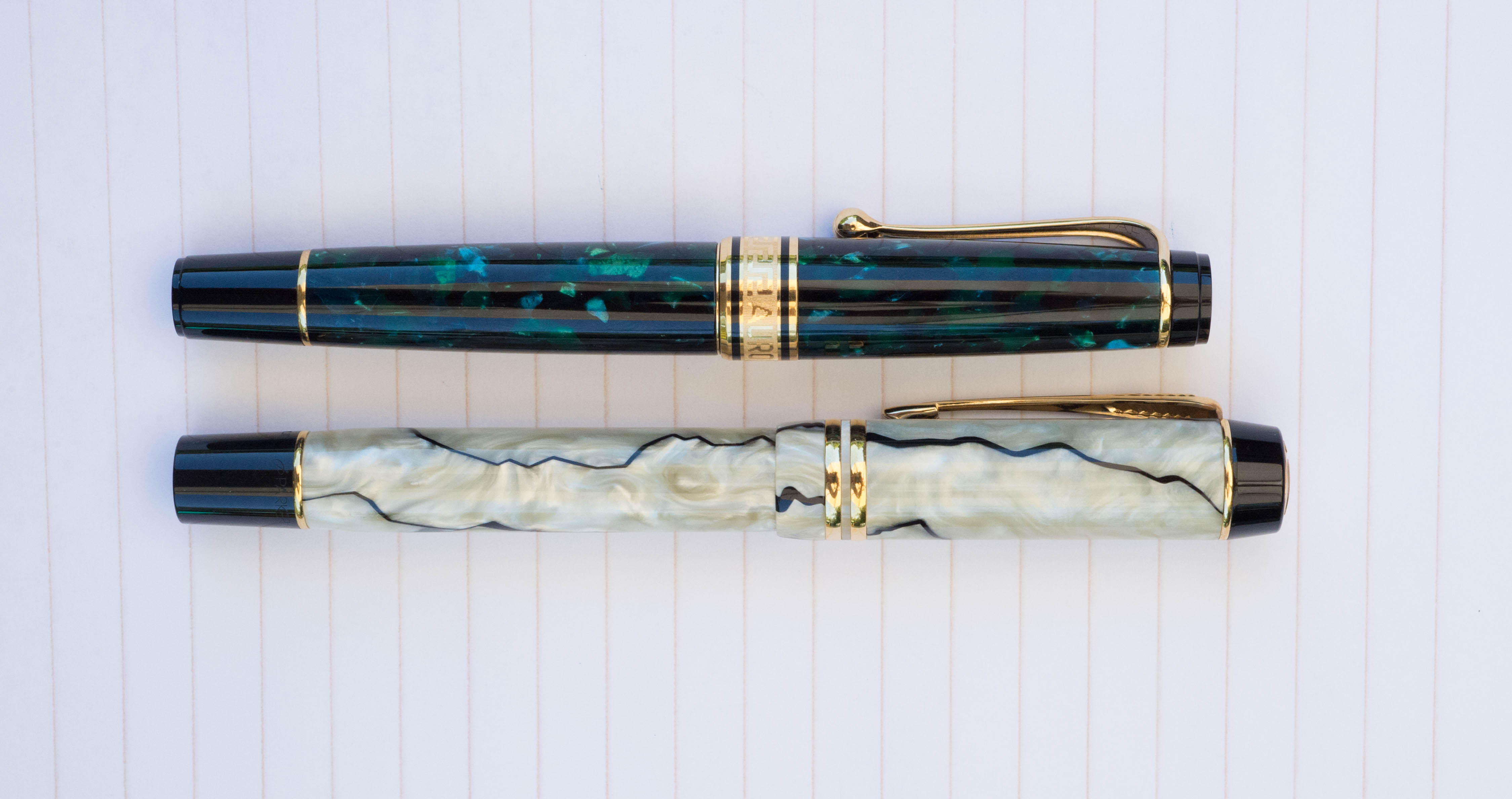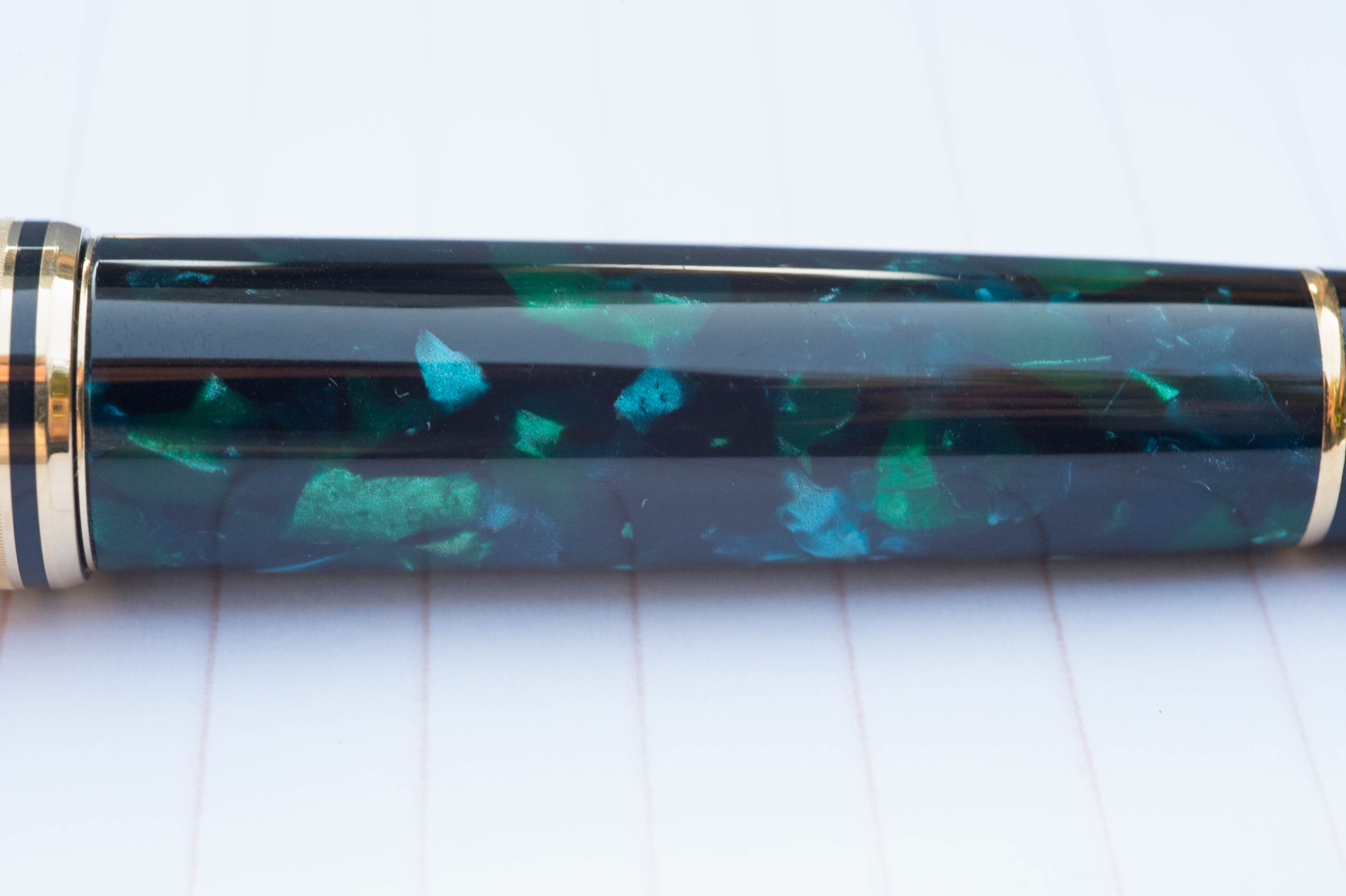 Apart from the demonstrators, I’ve tended to gravitate to Optimas from the regular line, featuring the multi-colored resin the Aurora calls Auroloide. I’ll append at the end of this review a segment from the television series “How It’s Made” that shows how Aurora makes a fountain pen. In the video, you can see how Aurora makes its own resin for the pen bodies, using plastic resin pellets that are melted in an injection molding machine into a liquid that is molded into pen parts. The Auroloide pen bodies would be formed from pellets of several different colored resins. My green Auroloide seems to be comprised of a variety of different greens and even some blue resin.
