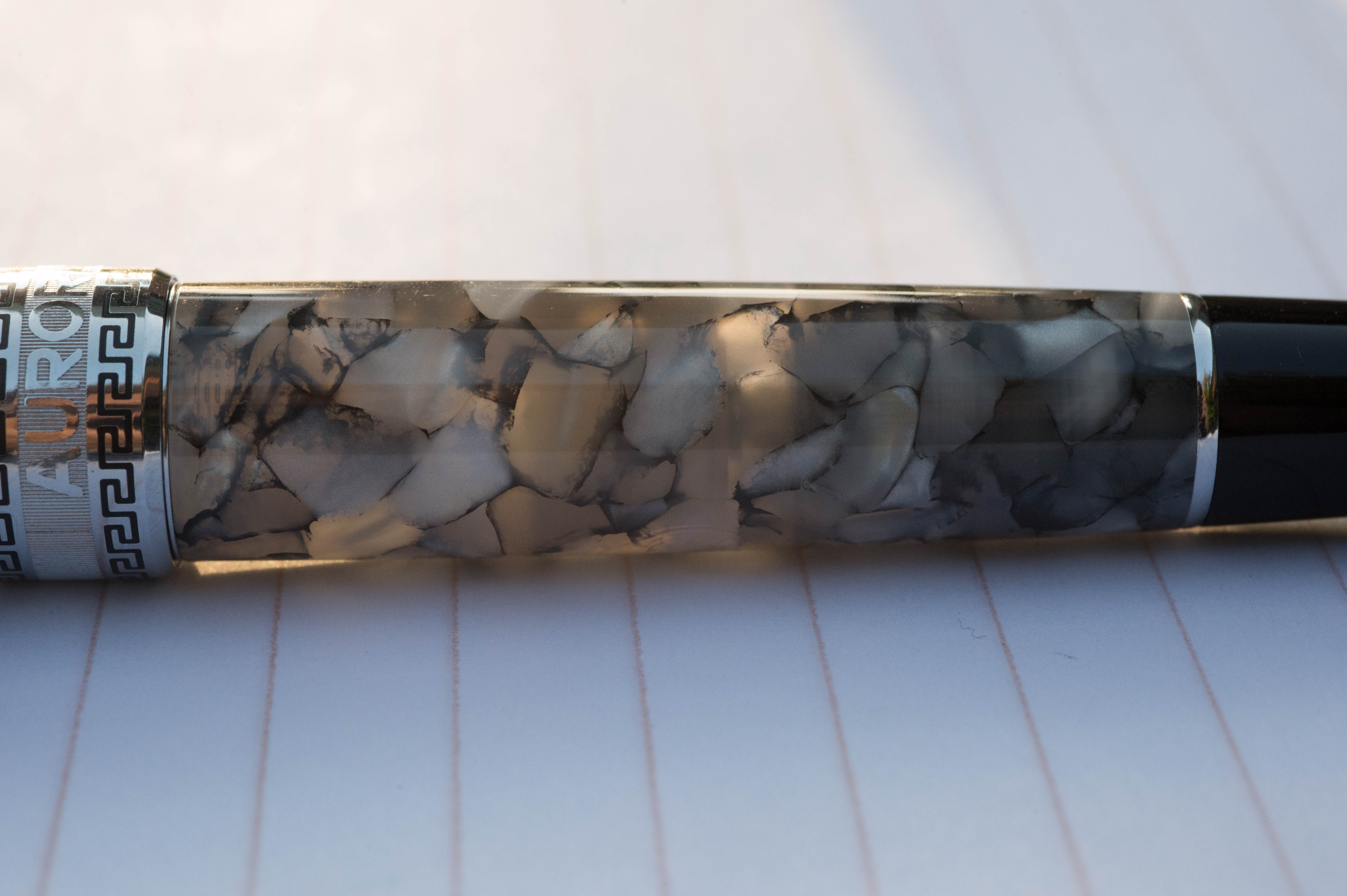 Aurora uses a variety of materials for the Optima. The simplest and perhaps sleekest is solid black resin with either gold- or chrome-colored trim. I don’t have one, yet, but a black and chrome Optima with extra-fine nib is one of the few pens on my wish list.