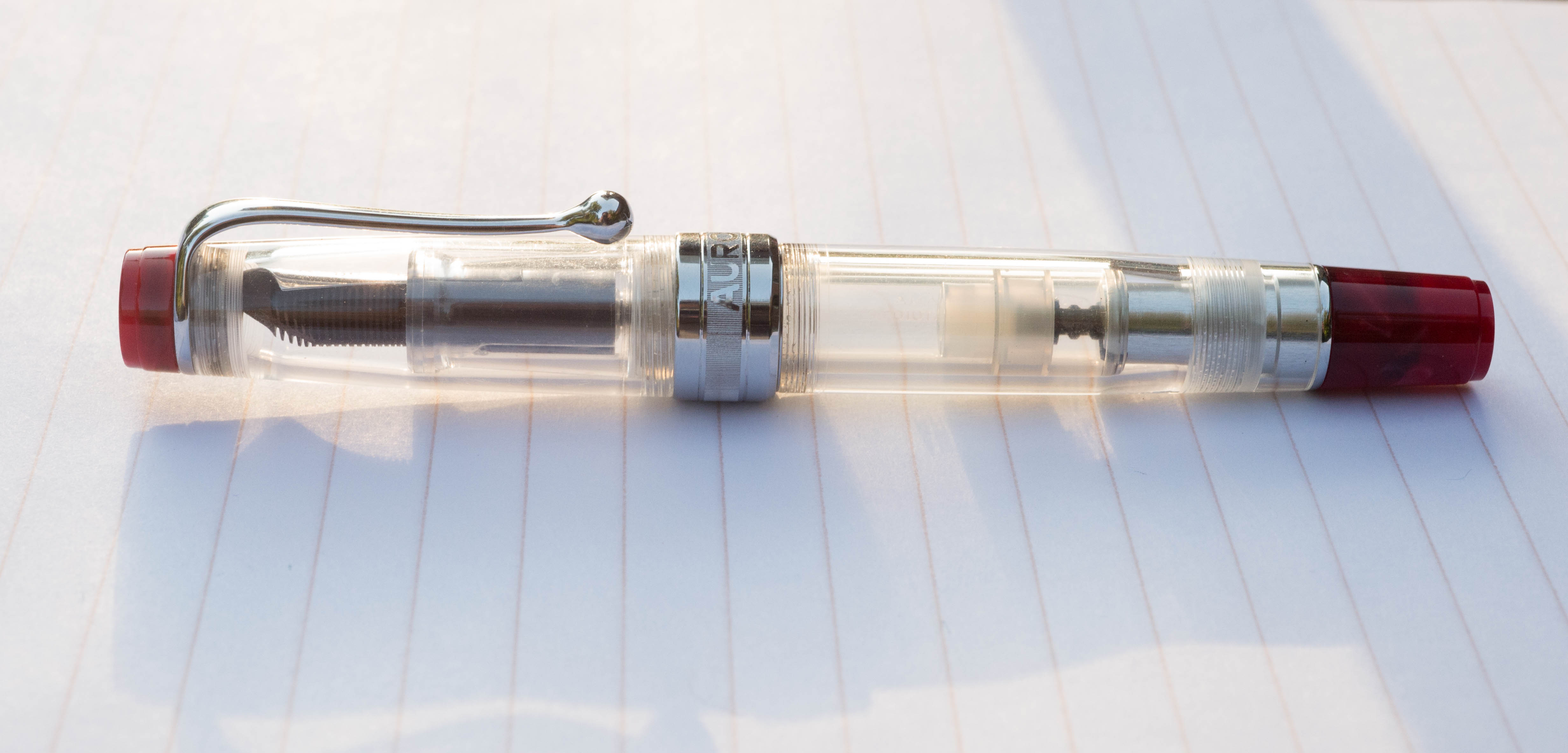 I did have one issue: one of my demonstrators spontaneously cracked apart where the body meets the section. This didn’t happen while the pen was in use, but while the pen lay empty in a pen case. It had never fallen or even taken a minor knock, so it must have been a weakness in the material. I have since heard of the same thing happening to another Aurora owner. However, it was only that one pen, and Aurora quickly and painlessly replaced the barrel, so I don’t worry about it. In fact, I actually feel better knowing that the service is so good.