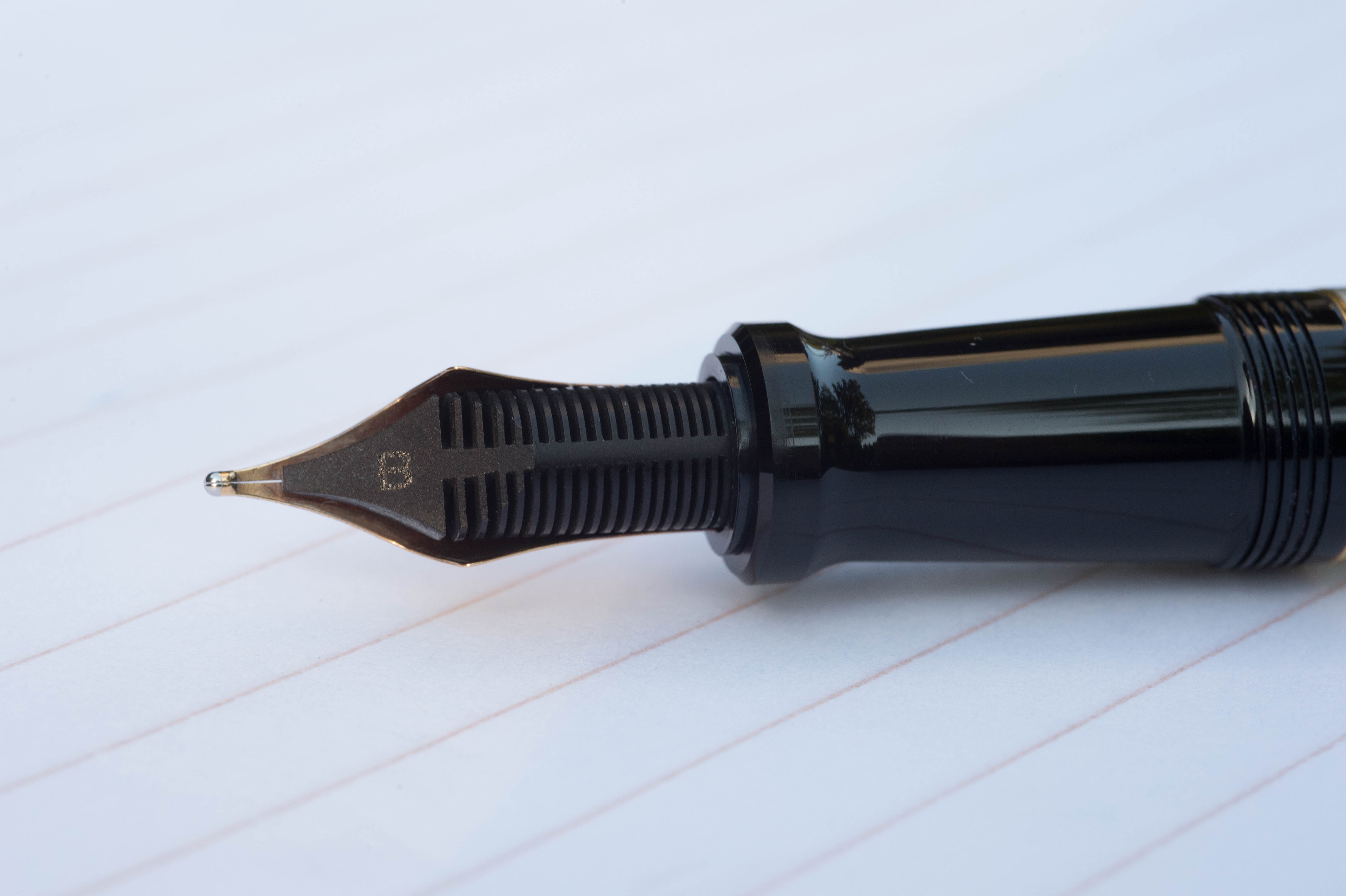 Optima nibs are hand-ground, so there is the typical small variance among nibs of the same size. The feeds are ebonite, which is lovely in a modern pen. Aurora marks the size of the nib on the feed, helpfully. I consider the ink flow moderate to medium, so I find that the pen handles a wet ink very well.