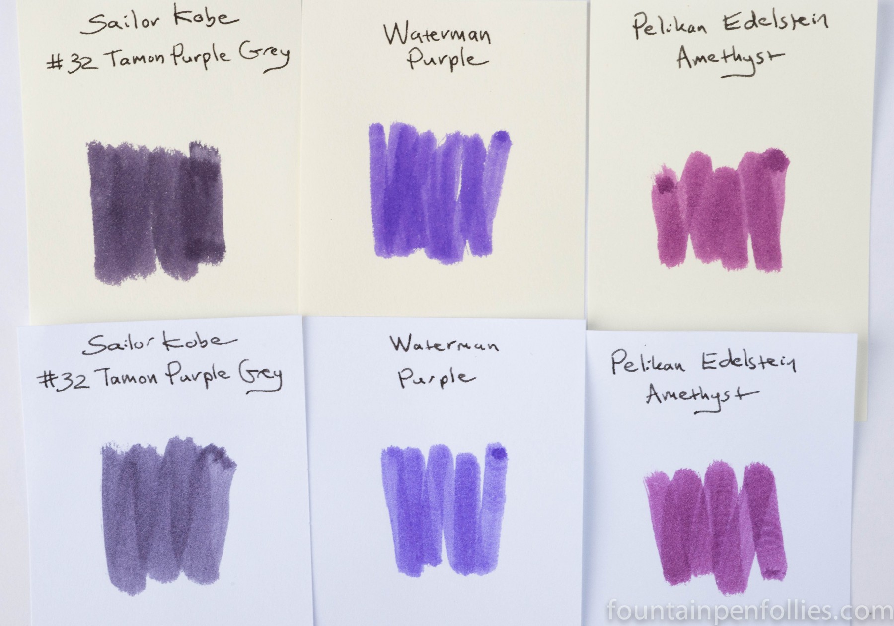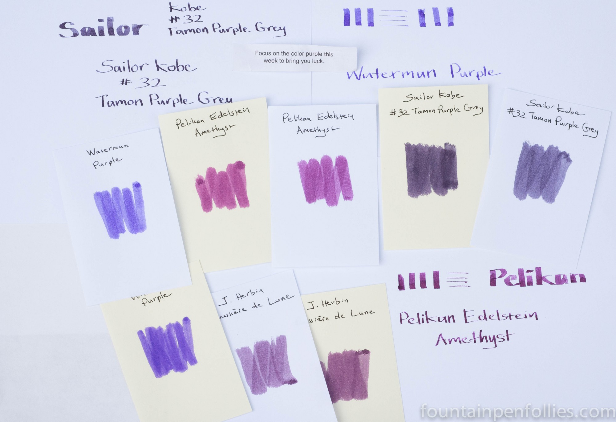 Among purple inks, I especially like Waterman Purple, Pelikan Edelstein Amethyst, Sailor Kobe Tamon Purple Grey and J. Herbin Poussière de Lune.