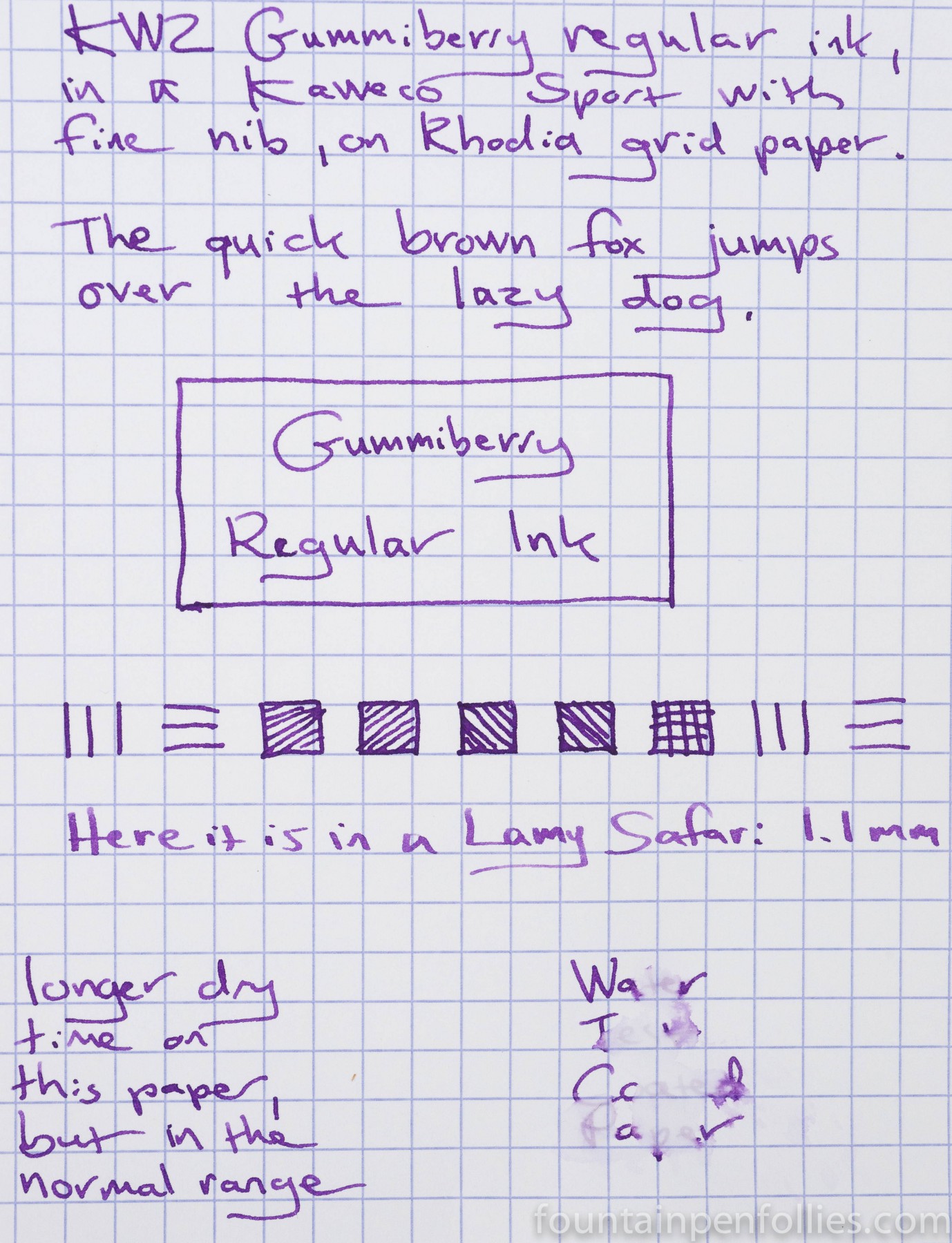I tested regular Gummiberry in a few pens: a Kaweco Sport eyedropper with a wet fine nib, a Waterman Laureat with a dry medium nib, and a Lamy Safari with both a dry extra-fine nib and a 1.1 mm stub. Unlike the iron gall version, regular Gummiberry looked different in different types of pen.