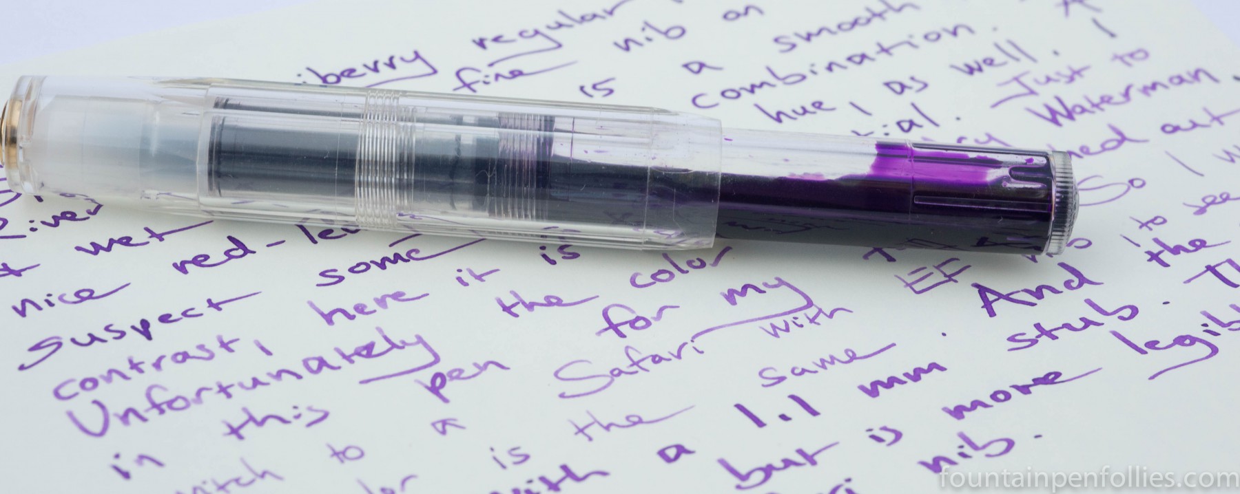 In the dry pens I used, it had less verve and vigor, but more delicacy. I like the stronger look, but folks looking for a pastel purple like Pilot Iroshizuku Murasaki-shikibu might justifiably prefer Gummiberry in its lighter guise.