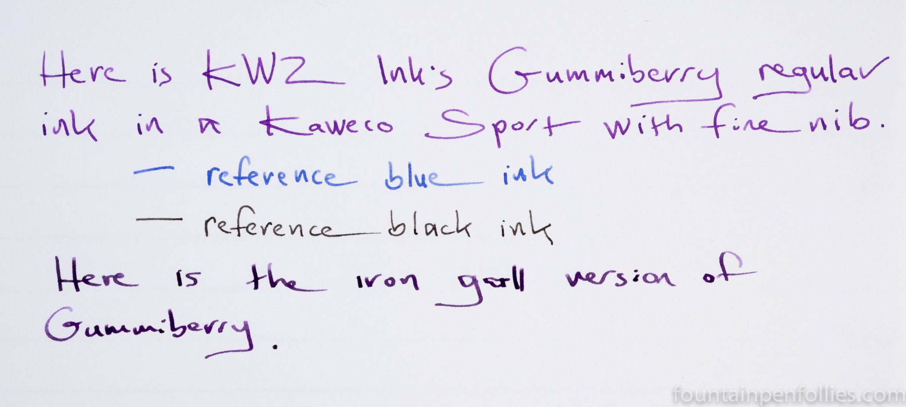 Here are writing samples of both Gummiberry inks, bracketing standard blue and black inks.