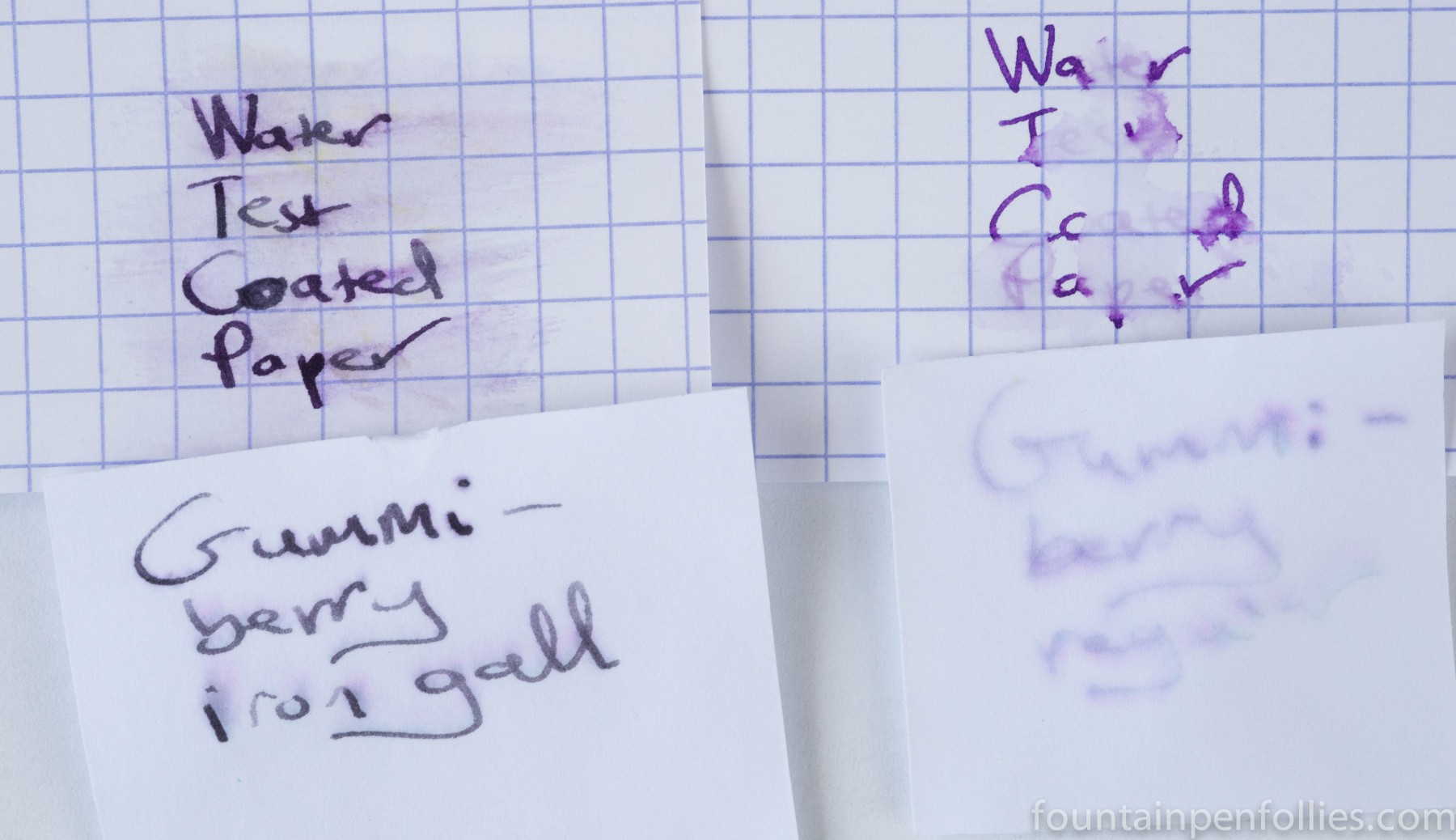 The two inks differ in water-resistance. As you’d expect, the iron gall Gummiberry has a waterproof core under the purple dye. In contrast, the regular Gummiberry mostly washes away. Here are water tests of both inks made on fountain-pen friendly Rhodia grid paper and lower-quality paper.
