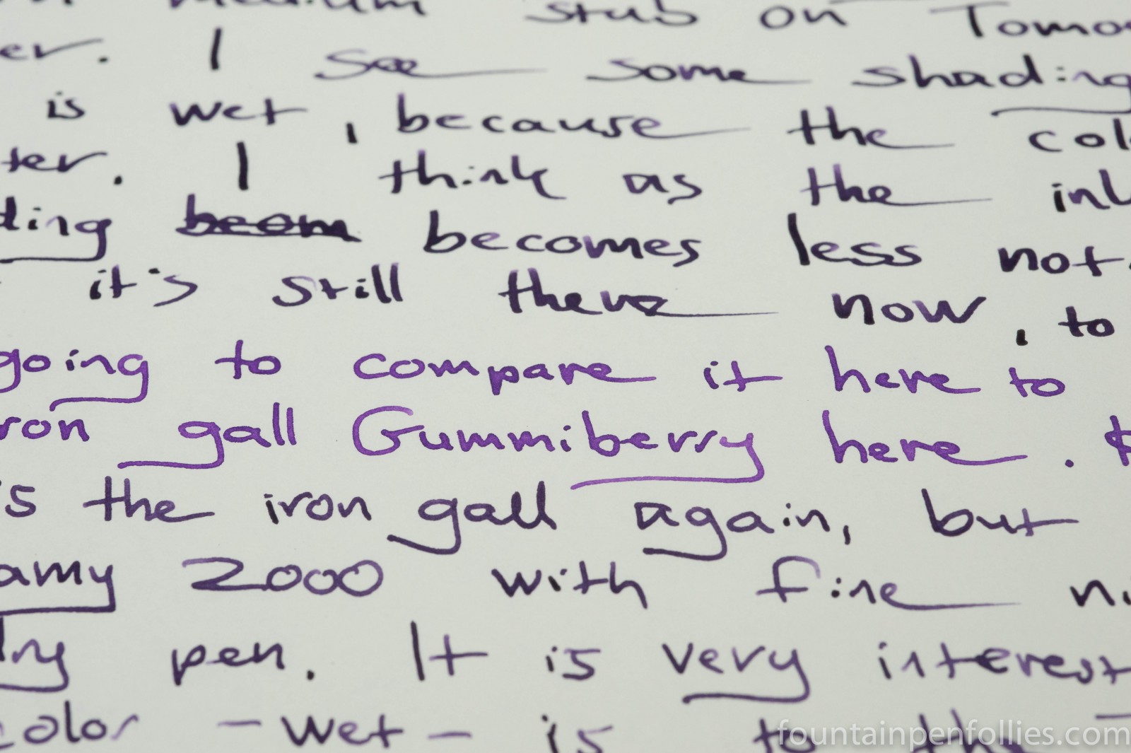 The most obvious difference between the inks is the shade of purple. Regular Gummiberry is a bright medium purple, while the iron gall component darkens the other Gummiberry. On some papers iron gall Gummiberry can look nearly black