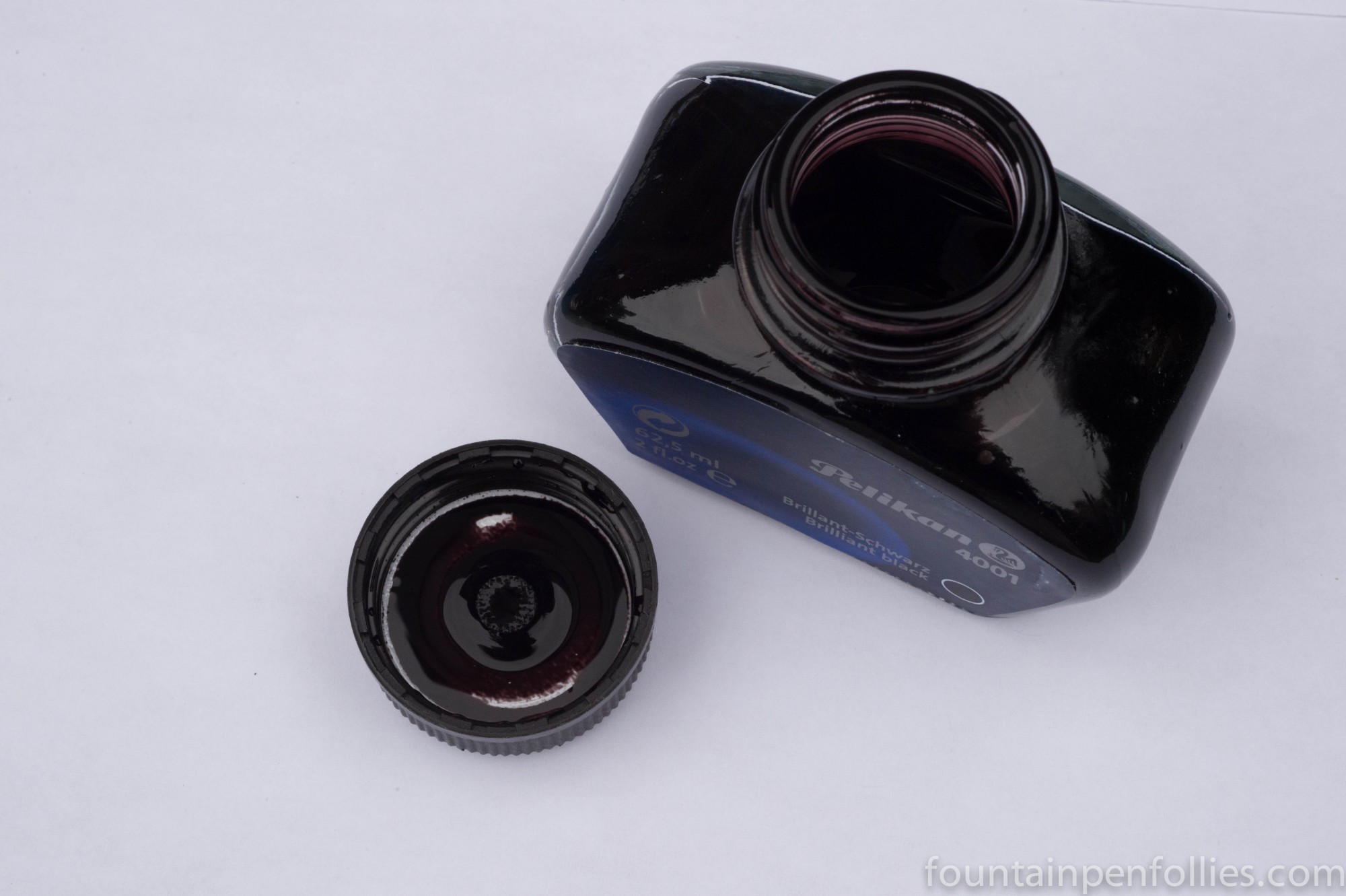 Pelikan Brilliant Black. A standard black ink that is a good bet if you have a wet writing pen or have to use poor quality paper. It has the nice quality of writing with a narrow line, which keeps your fine lines fine. It’s dependable, reasonably priced and has very decent water resistance. But it’s also a dry ink, so with a dry pen it can look gray.