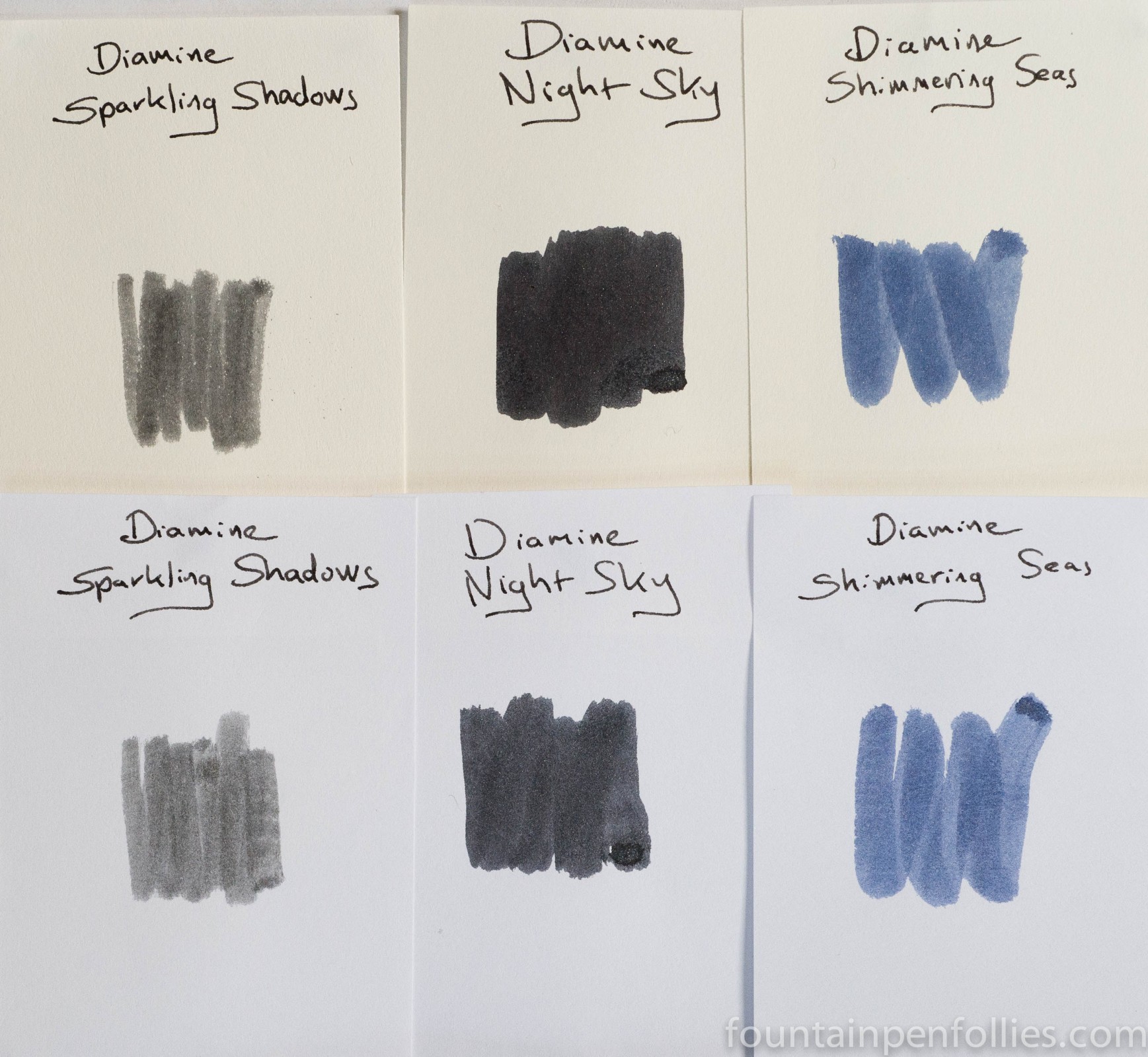 Looking at the Shimmertastic line, it seems to me that Night Sky fits in especially nicely with Sparkling Shadows, the gray ink with gold shimmer, and Shimmering Seas, the blue black with gold shimmer.