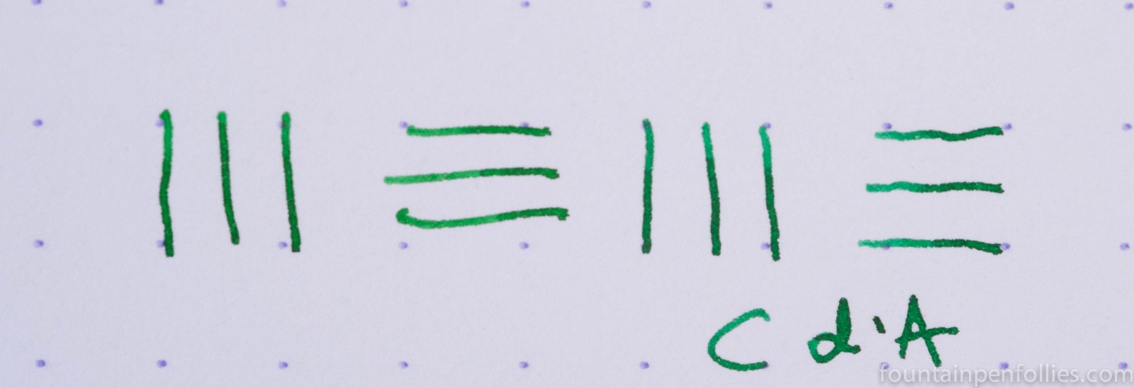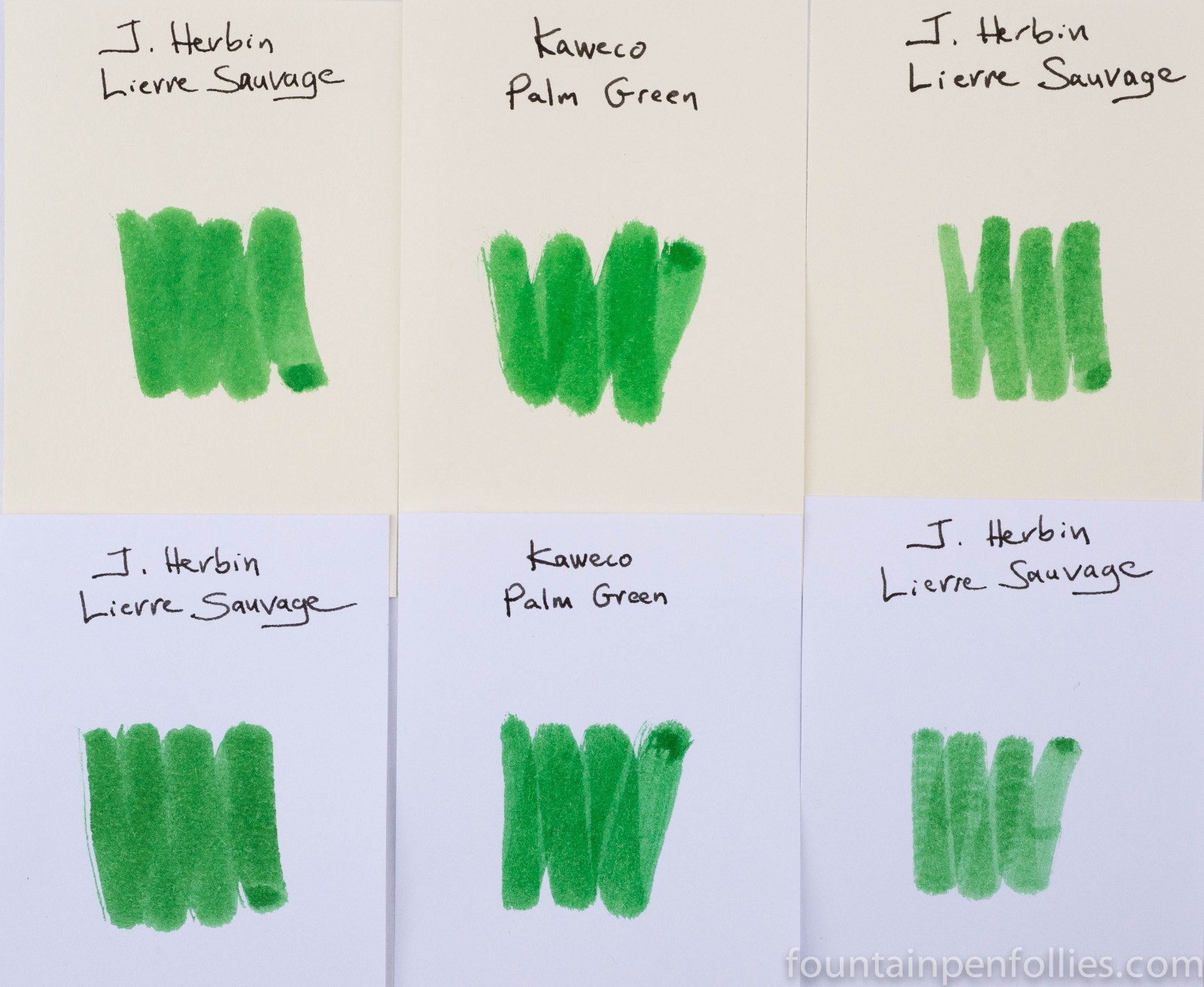 For me, the closest comparison was J. Herbin Lierre Sauvage, but with a caveat. Lierre Sauvage can be a close match when used in a very wet pen. From a normal or dry pen, Lierre Sauvage is lighter, less saturated and I think slightly more yellow. You can see that in the swab array above.