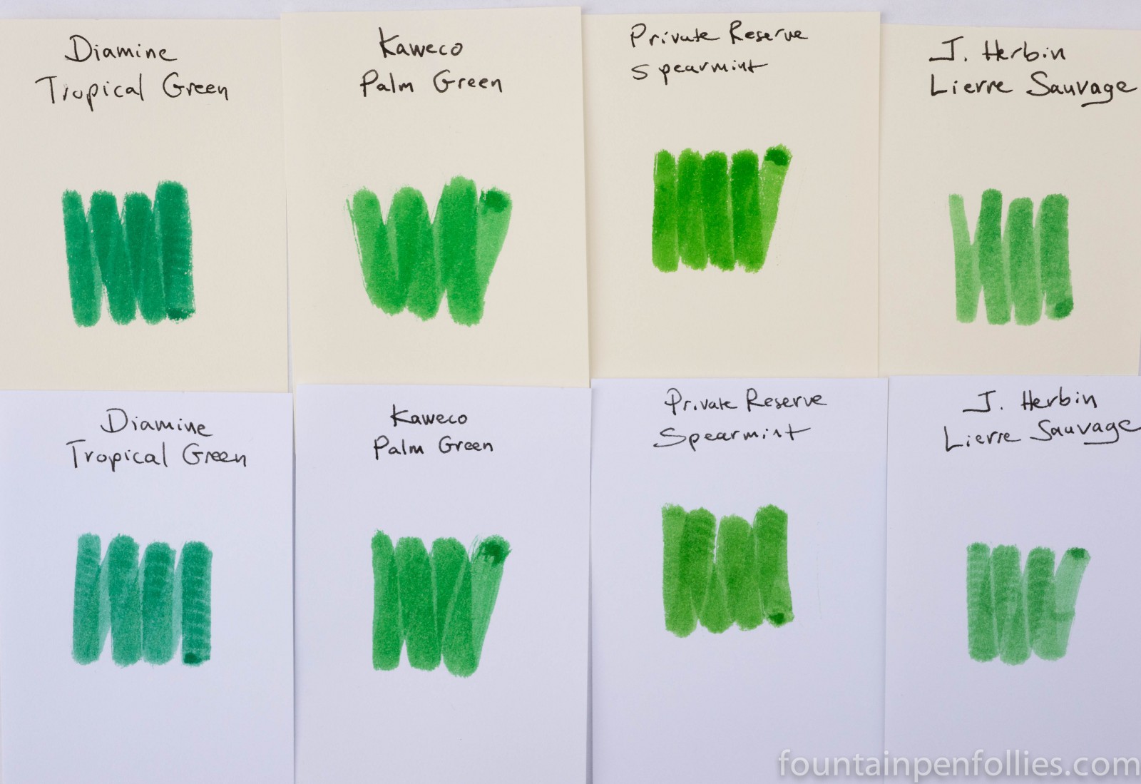 Diamine Tropical Green is more blue. Private Reserve Spearmint much more yellow. J. Herbin Lierre Sauvage looks more yellow and less saturated.