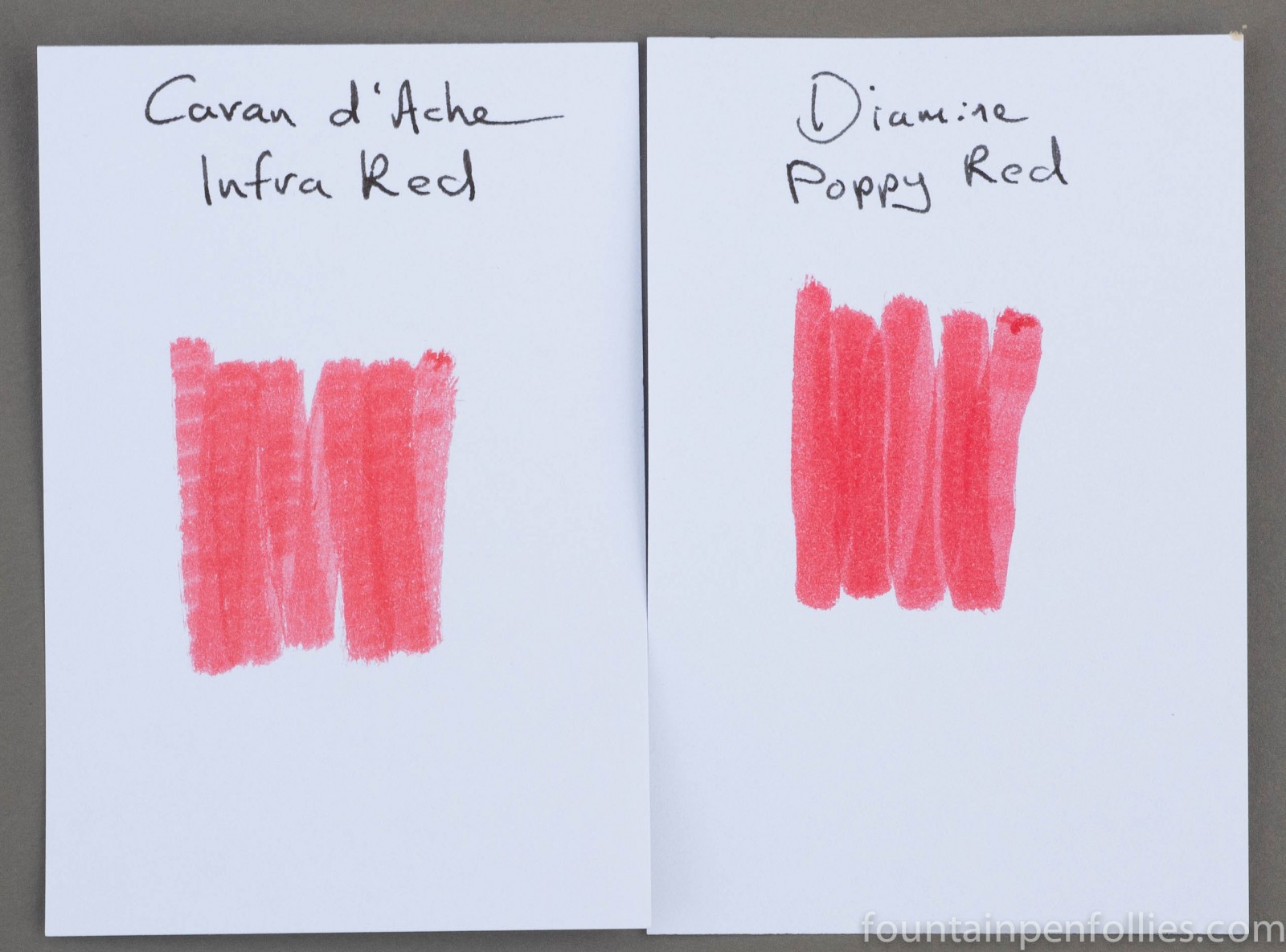 However, Caran d’Ache Infra Red is more orange and less saturated, and shades more. Diamine Poppy Red is more saturated and is closer to straight red.