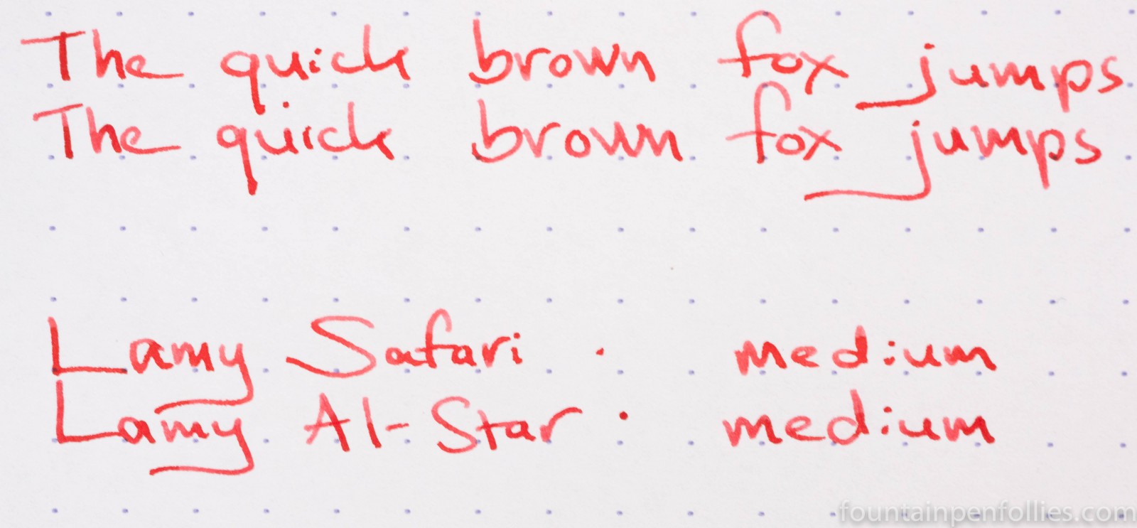 Evaluating each in a Safari/Al-Star with medium nib, the line width seems the same as well, with both running slightly on the wider side. In this photo, Caran d’Ache Infra Red is on top and Diamine Poppy Red is below.