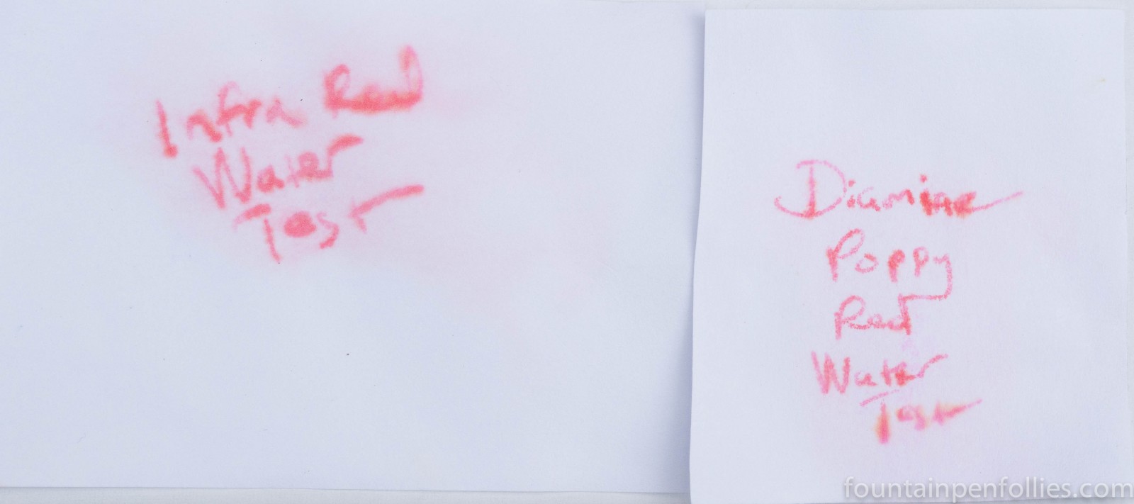 Paper towel chromatography reiterates how similar the ink mixtures are. However, just as in the writing samples, the Diamine is more saturated and redder, while the Infra Red shows comparatively more orange and has a softer profile. The photo below shows Caran d’Ache Infra Red on the left and Diamine Poppy Red on the right.