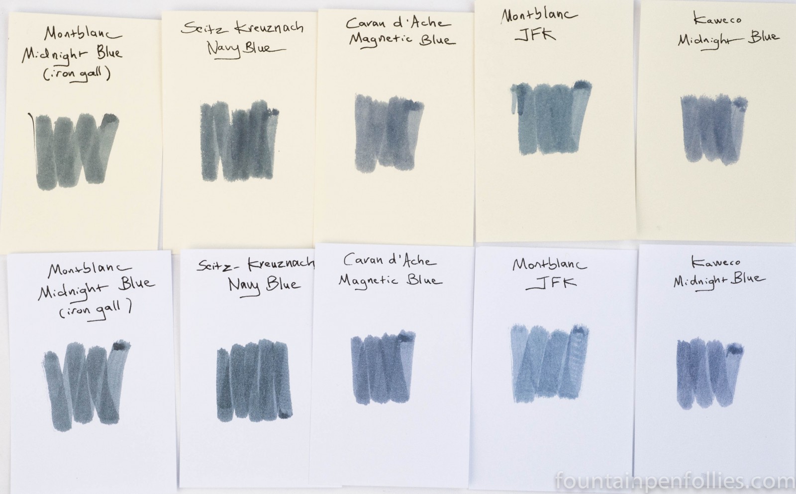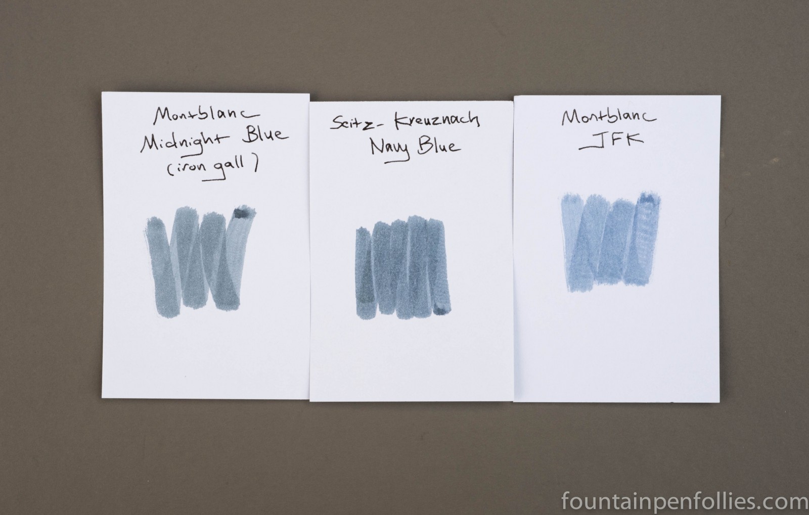 Here is a closer comparison to the two Montblanc inks: on the left is the older, no longer available, Midnight Blue with iron gall, and on the right is the current limited edition JFK ink, which is more blue.
