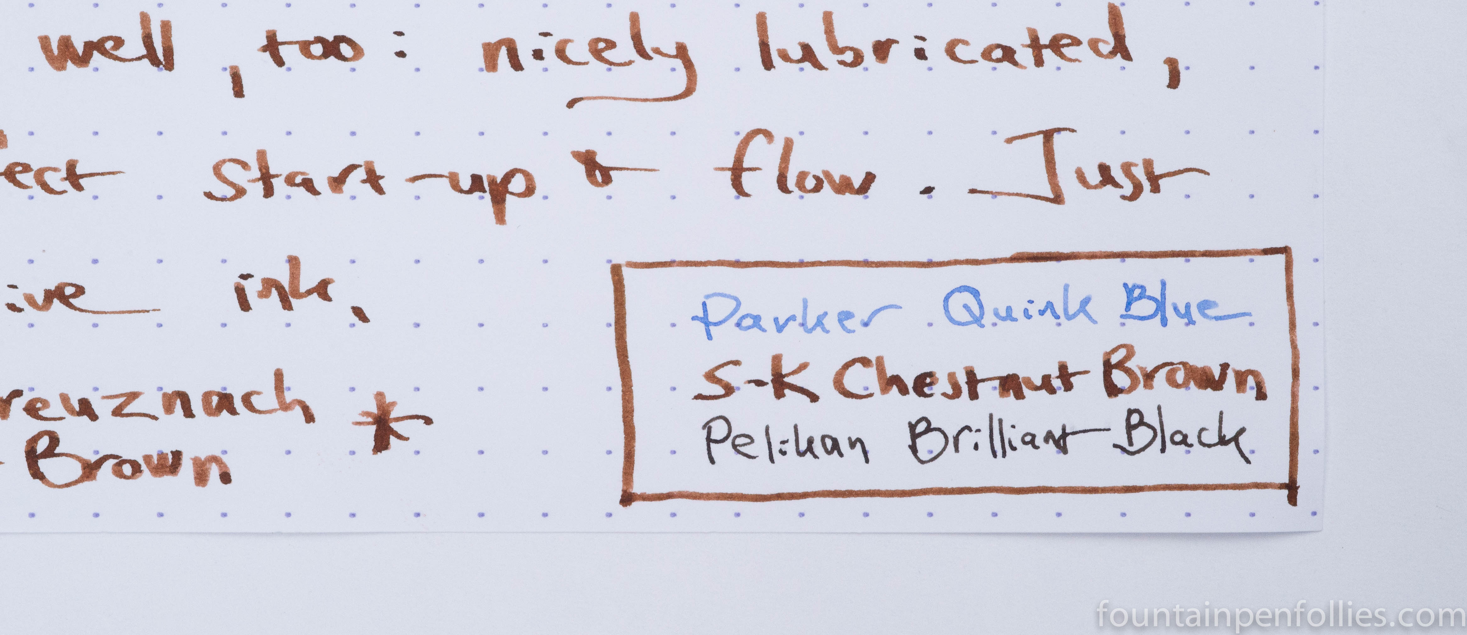 Here is a snippet of Seitz-Kreuznach Chestnut Brown bracketed by a standard blue and black ink, for context.