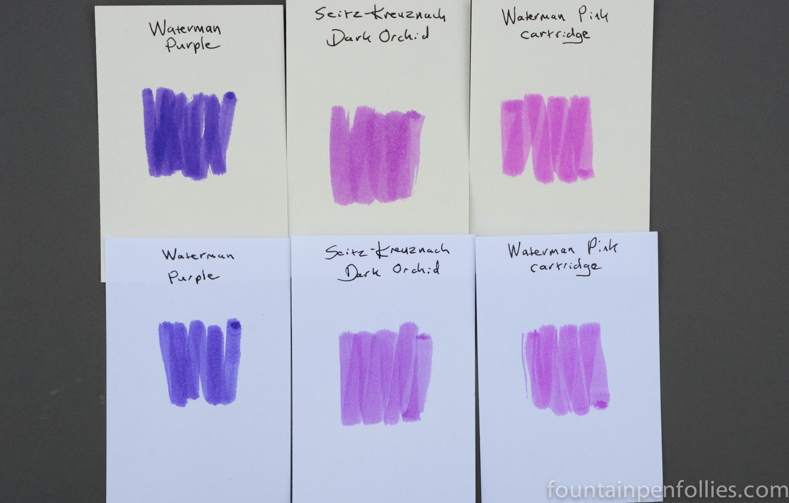 I’m not sure if I would classify it as a slightly blue magenta or a very pink purple; it could fit in either category. It actually looks just a little more blue than Waterman Pink, which is a bright pure magenta. Here you can see it compared to the standard Waterman Purple, on the left, and Waterman Pink, on the right.
