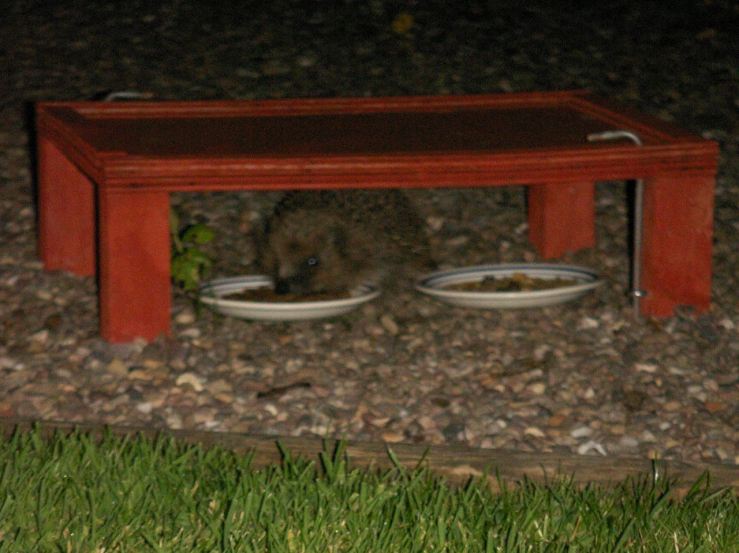 Let’s kick off the week, then, with this adorable hedgehog. My friend emailed me this — she set up a hedgehog feeding station in her yard.